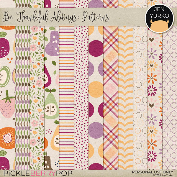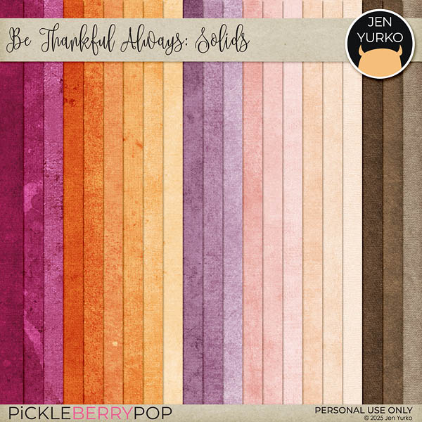 Celebrate the harvest season with Be Thankful Always by Jen Yurko — a rich digital download pack designed for autumn scrapbooking, journaling and memory-keeping. This kit includes 52 unique design elements, 12 patterned papers and 21 solid papers, all in a warm fall palette perfect for Thanksgiving, cozy moments, family gatherings and golden-leaf days.