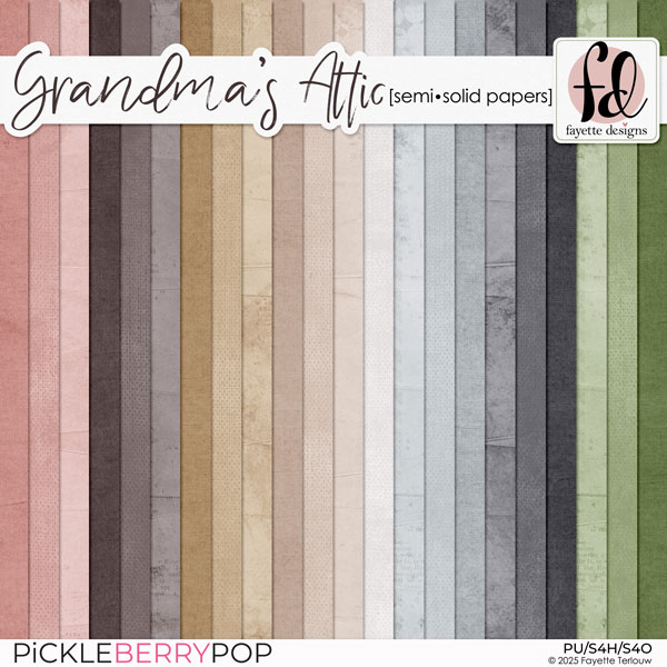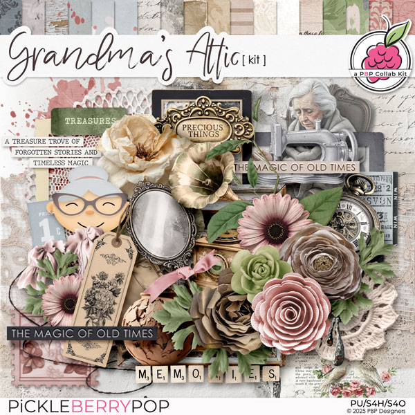 User our October PBP Collab Kits, Grandma’s Attic, to scrap about the adventures you remember about your grandma's attic, or those that your grandkids are enjoying in your home! Grandma's Attic is a charming digital scrapbooking kit filled with soft, nostalgic tones that will help you create beautiful layouts with ease. Inspired by treasured keepsakes and timeless memories, this collection captures the warmth and beauty of days gone by and is perfect for preserving family stories, heritage pages, and heartfelt moments.