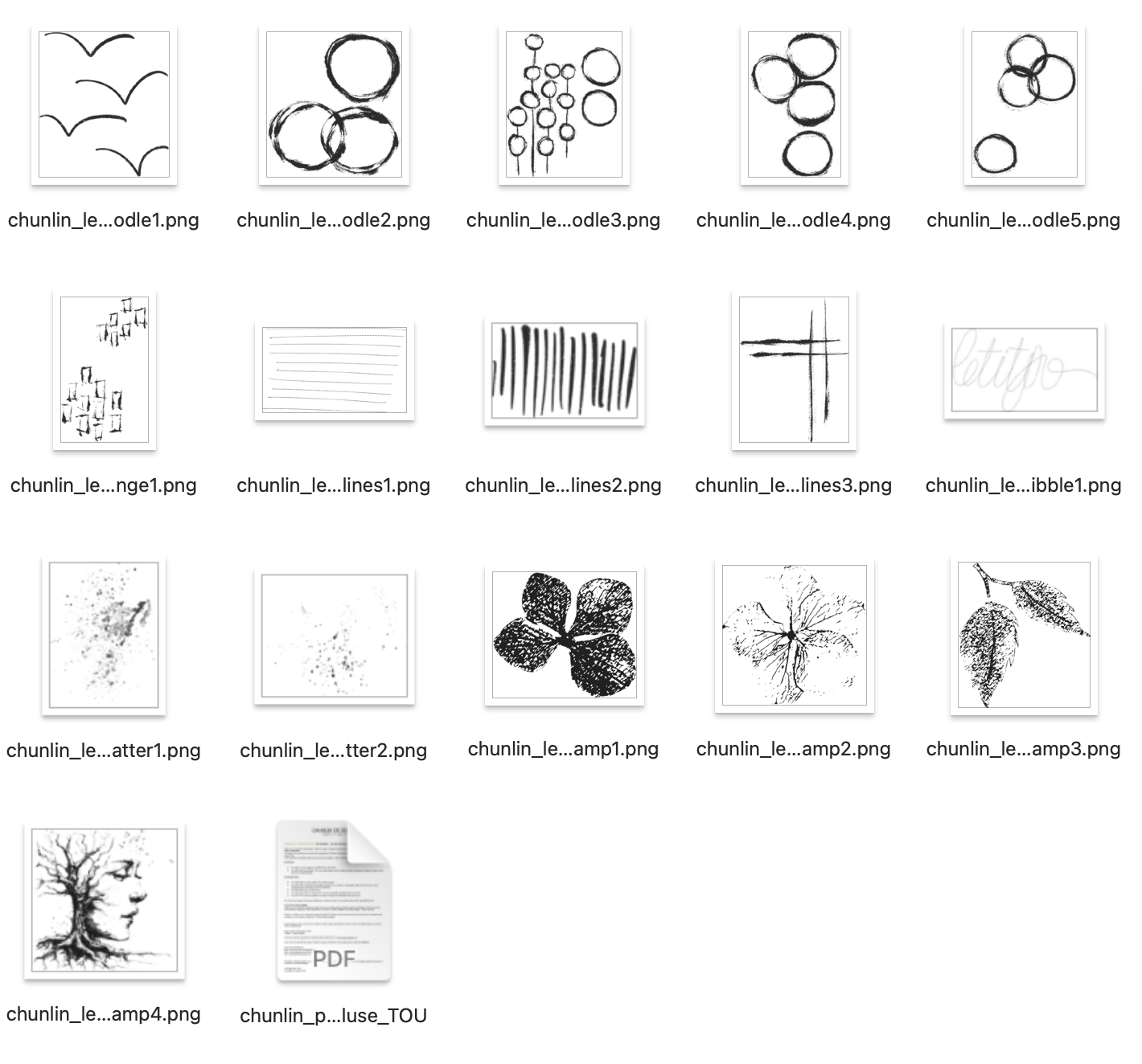 16 unique hand-drawn scribbles, stamps & inked pieces in .png format