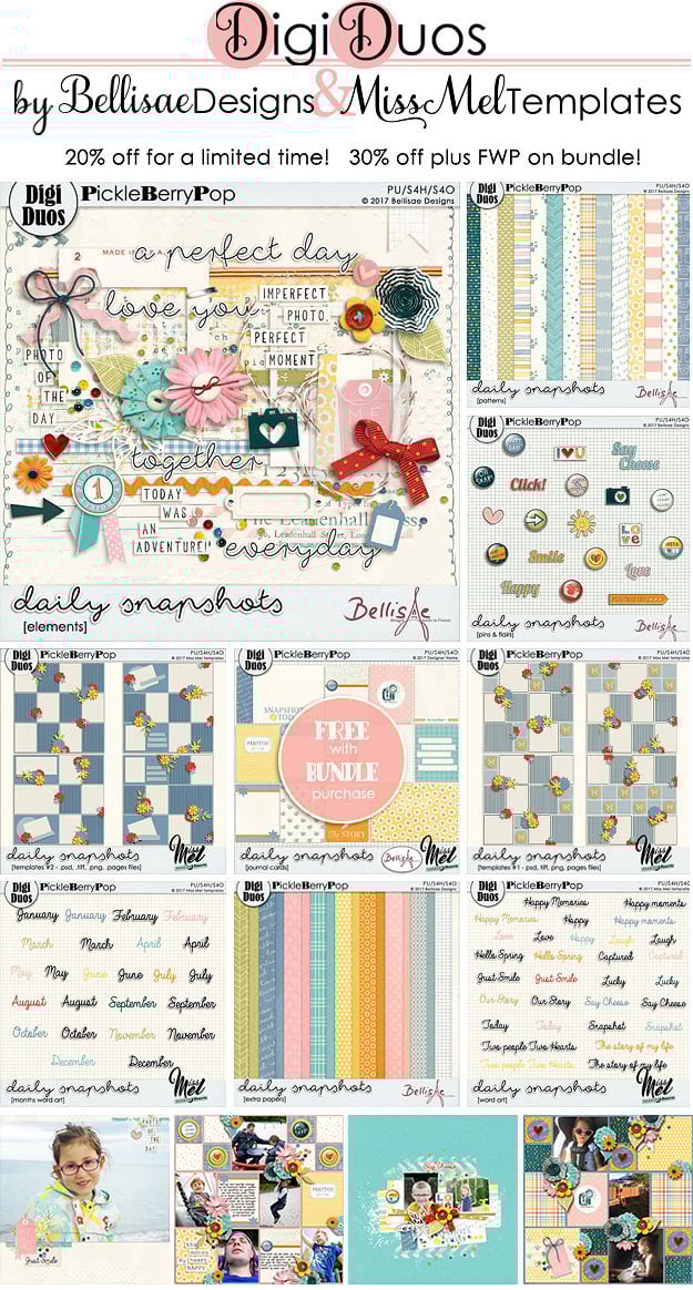 We have another gorgeous Digi Duos Collection from Bellisae Designs & Miss Mel Templates called Daily Snapshots. If you’re a Project Life scrapper, then you won’t want to miss this one. Lol, and if you’re not a PL scrapper, you won’t want to miss it either! It’s filled with gorgeous designs that will help you create quick, beautiful layouts! Enjoy!