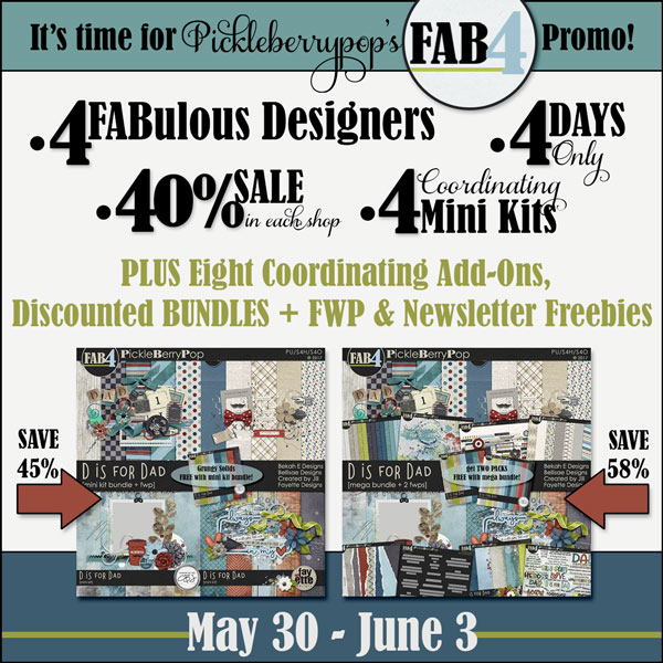 You’ll see LOTS of 4’s during our FAB4 Promo! 4 Designers, 40% SALE for 4 Days. They have also created 4 Coordinating Mini Kits (plus some gorgeous Add-Ons), and are offering 4 Coordinating Subscriber Freebies. Phew…that’s a LOT of 4’s!