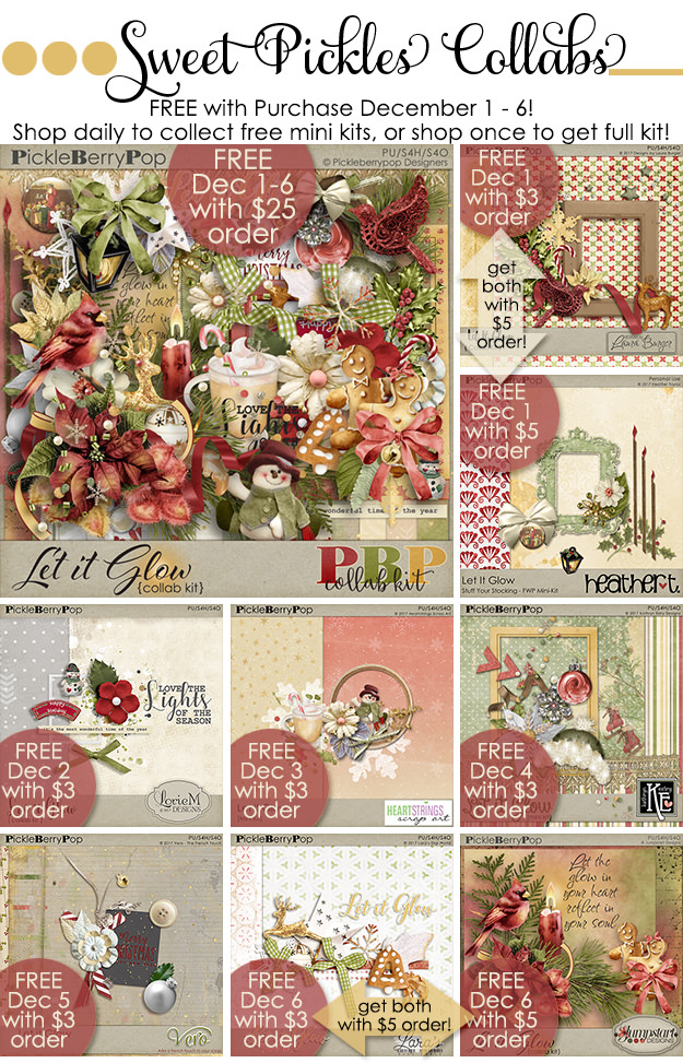 If you’re too busy to shop each day, just spend $25 in one transaction during each FWP period (Dec. 1-6, Dec 7-12 and Dec 13-18) and you’ll receive one of three kits that is made up from each FWP period’s mini kits. That way you won’t have to come back each day to get your Stockings Stuffed with the individual mini kits! (The mini kits will show up in your carts because of the way the FWP offers are set up, but you won’t need to download them.)
