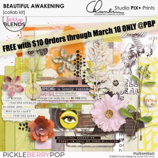PLUS, we have a brand new Berry Blends FREE with PURCHASE Kit for you! Check out our PU New Releases and our CU New Releases…and remember that CU Goodies are fun to use on PU pages! Spend $10 in the PBP Shop through March 10, and you’ll get this amazing and artsy digi kit by Chunlin Designs and Studio Pix+ Prints. I LOVE how their styles combined and think you’ll agree!