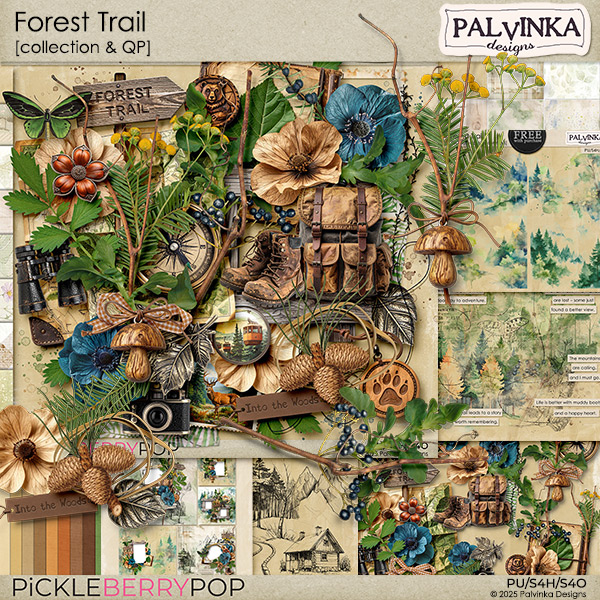 One of my favorite products in my shop is the Forest Trail collection. I’ve always loved nature, and this collection feels very close to my heart. Last summer we spent a lot of time hiking in the mountains and walking through forests, which gave me many favorite photos to scrapbook. We also have a cottage near the forest where we love to spend time, so Forest Trail reflects a place and feeling that is very special to me.