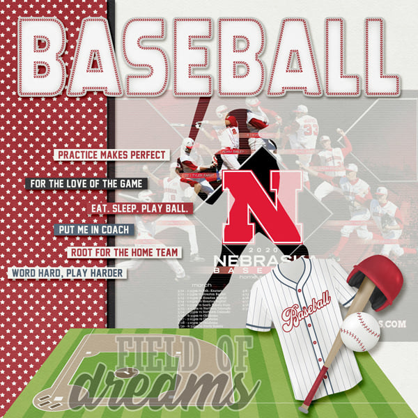 Batter Up Kit includes 24 papers (8 plain, 16 patterned) in JPG format and 82 elements in PNG format. Element listing includes: all star star, ampersand, arrow, baseball, baseball word art, bat, bottlecap, bow, button, catcher's gear and mask, cleats, clip, confetti scatter, fastener, baseball field, flag, 10 flowers, 2 frames, glove (and glove with ball), 3 greenery pieces, heart, 2 helmets, jersey, label, love word art, paper border, pencil, photo corner, 6 ribbons, ricrac, score board, 3 baseball player silhouettes, staples, 4 stars, star line, star scatter, 2 rows of stitches, 5 strings, tag, tape piece, 2 tickets and 10 word strips