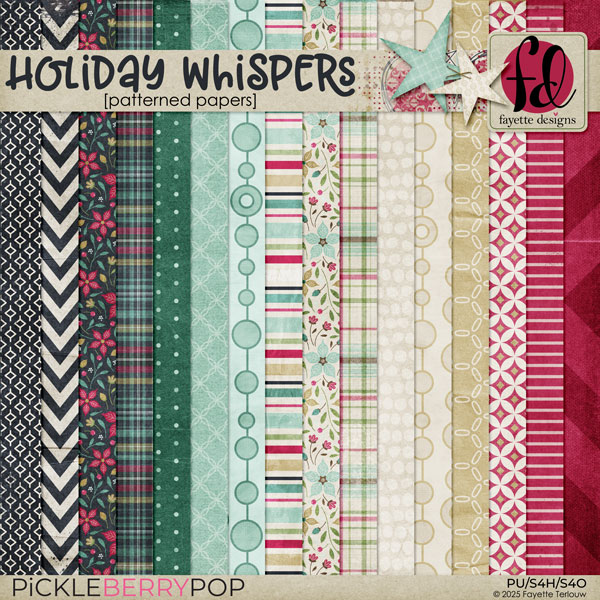 Download includes Holiday Whispers Kit (Elements & Patterned Papers), Artsy Papers, Background Fancies, Semi-Solid Papers and WordArt.