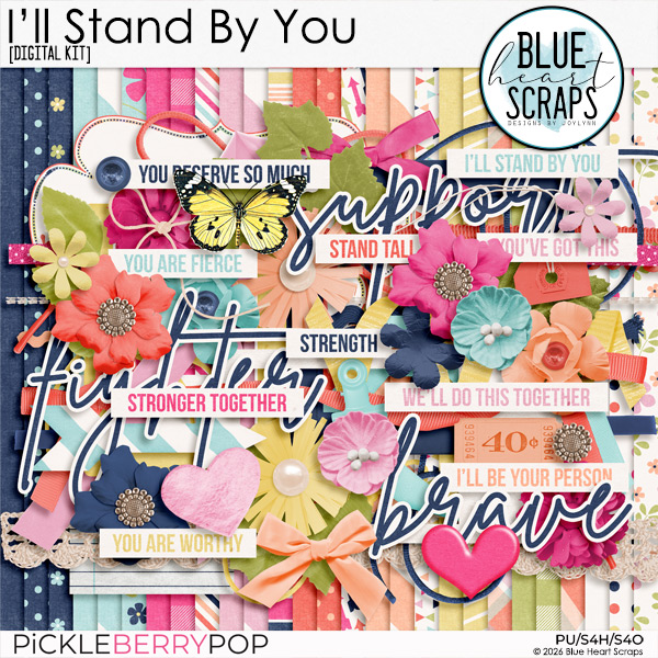 I'll Stand By You Bundle includes: Full Kit (27 papers, 68 elements), 8 Journal Cards, 5 Grunge Edges, 15 Flairs, and 36 Ombre Papers