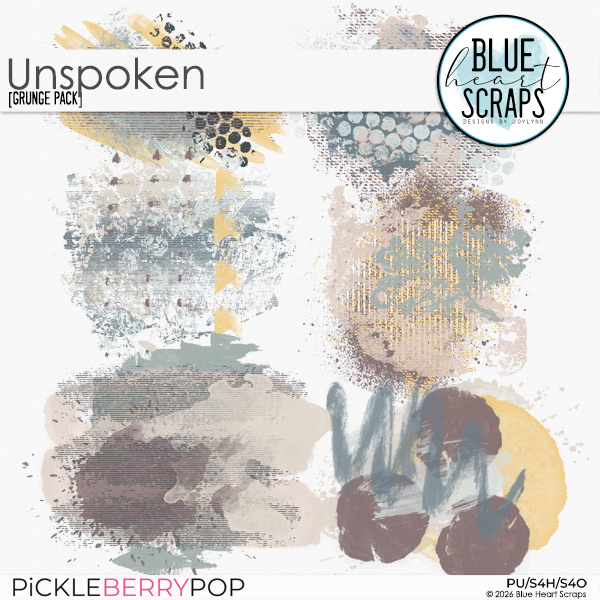 Unspoken Collection Bundle includes Full Kit (30 papers, 81 elements), 6 Grunge Paints, 44 Ombre Papers, 38 Tabs and Tags, 6 Titles, 20 Washi Pieces and 55 Word Bits