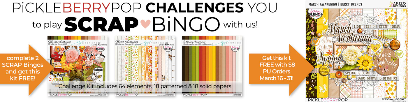 Play BiNGO - SCRAPBOOK STYLE with us this month! You choose your challenge cues & create layouts YOUR WAY to earn prizes! Join in the fun, complete two bingos and earn our Challenge Reward Kit! It coordinates with our FWP Kits in the Shop! Collect both of them!